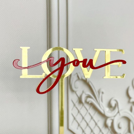 Топпер акриловый «Love you» золотой с красной надписью